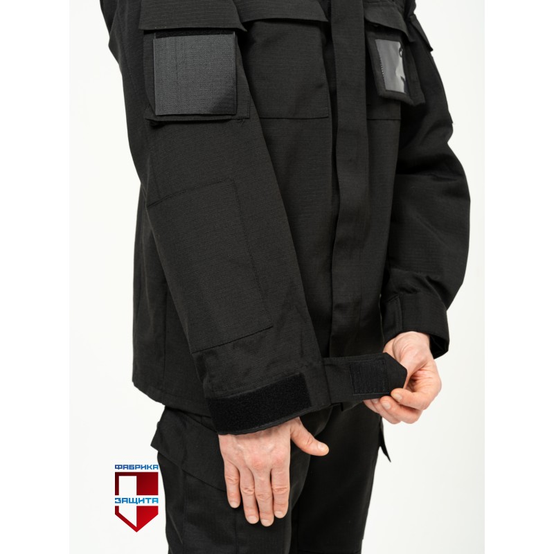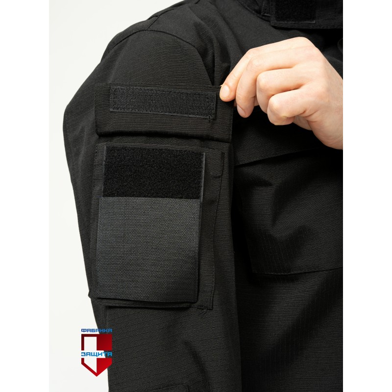 Карманы. Китель: 2 на груди и 2 на рукавах, на липучках. Брюки: 2 боковых накладных на липучке с утяжкой, 2 прорезных боковых, 2 задних накладных на липучке. На кителе так же присутствует отстегивающаяся накладка под бейдж на левый нагрудный карман (верх крепится на пуговицы, низ - на липучке). Над правым нагрудным карманом пришита стропа для крепления рации или фонарика. Манжеты рукавов на липучке. На рукавах присутствуют усиленные налокотники. Так же на костюме уже пришиты липучки под шевроны на рукавах и спине. Низ брюк выполнен в виде резинки и со штрипкой, где резинку можно аккуратно отрезать, в зависимости от того, как Вам удобней их носить: прямыми или в заправку. Притачный пояс брюк, регулируется по объему при помощи эластичной ленты в области боковых швов. Ширинка штанов на молнии. Брюки так же обладают дополнительными усилителями сиденья, наколенников.
